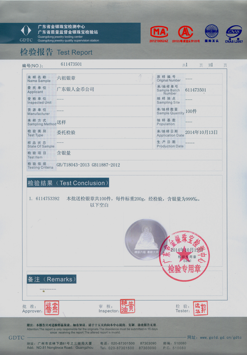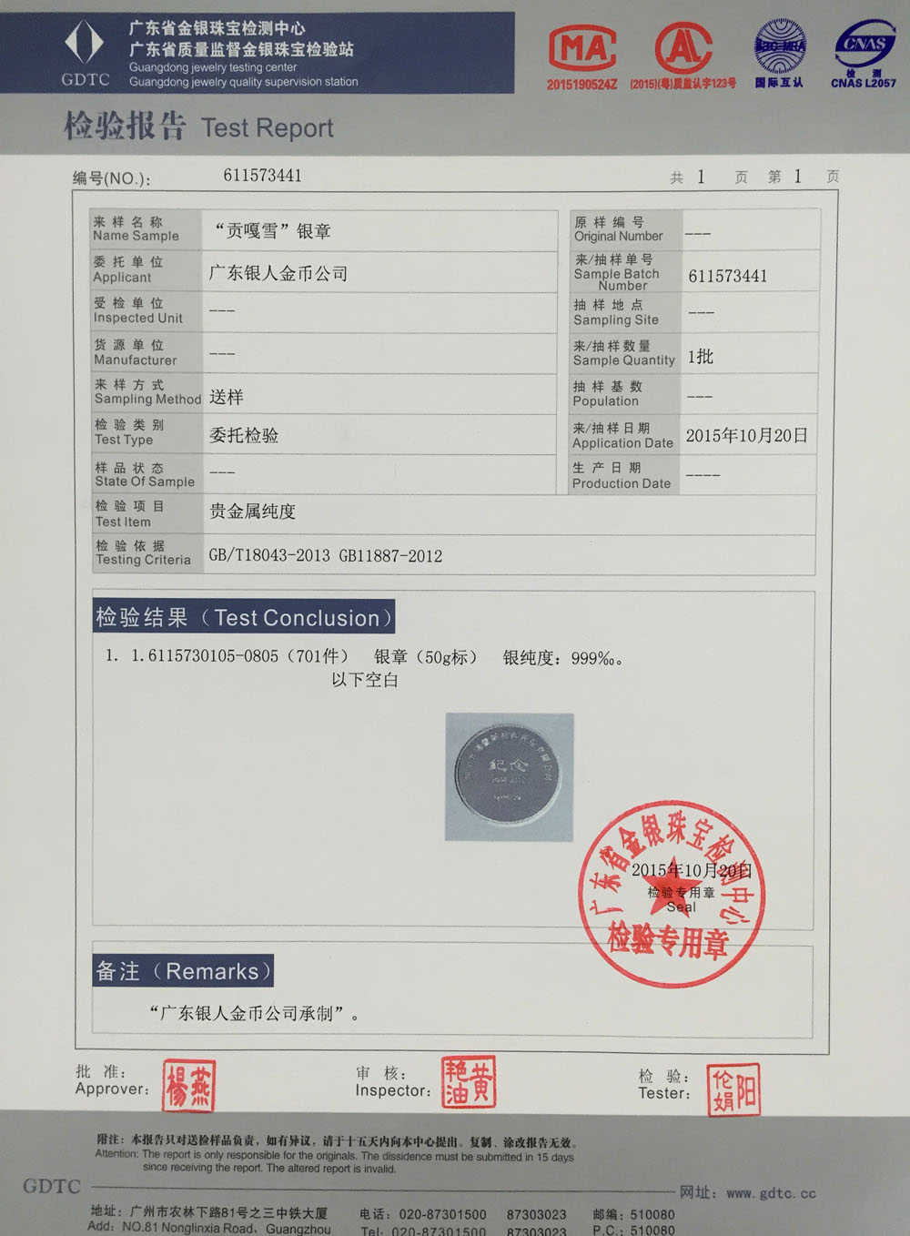 廣東省質監白銀純銀紀念幣章檢驗報告