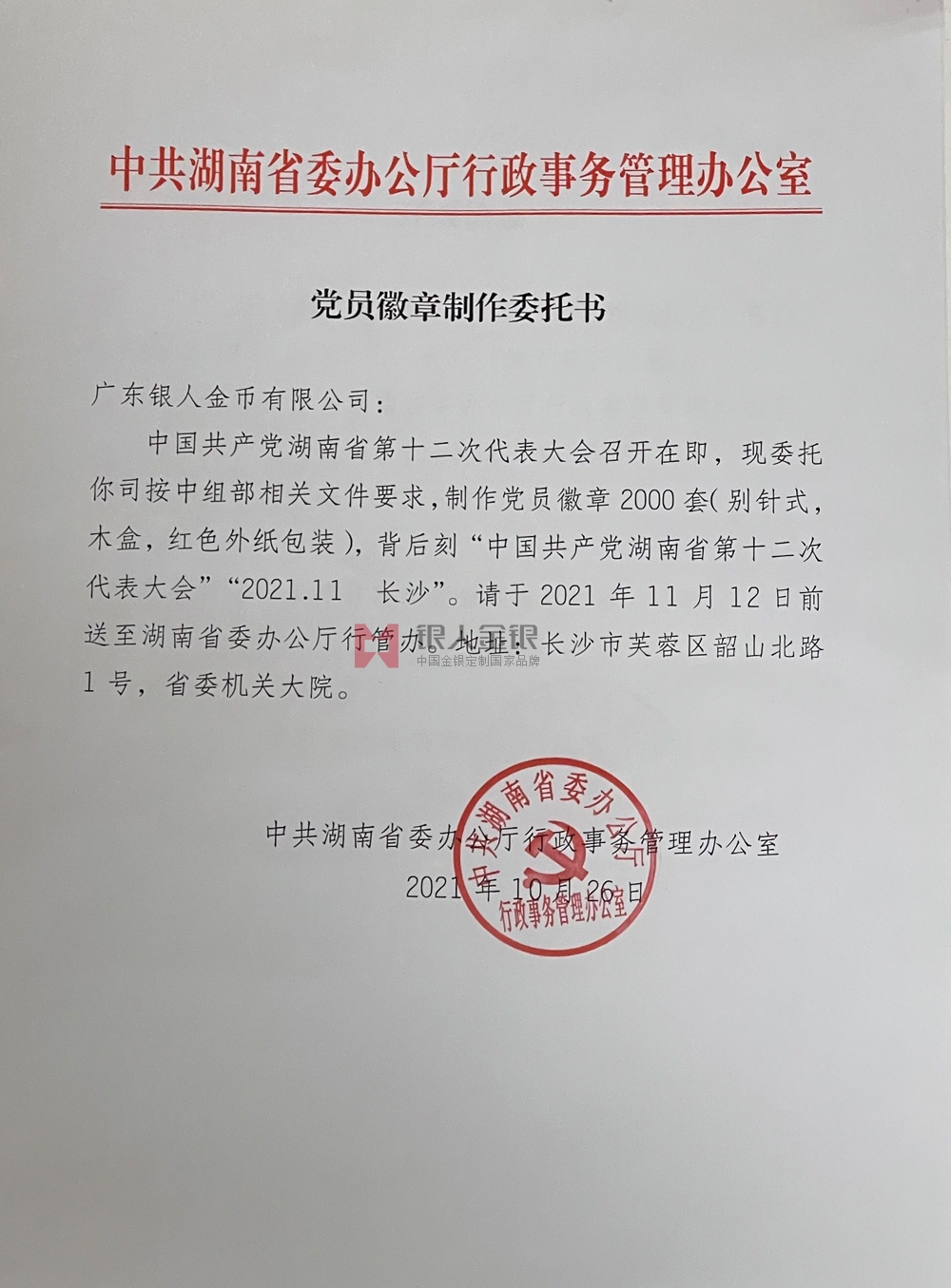 中共湖南省委購買黨徽紅頭文件公函