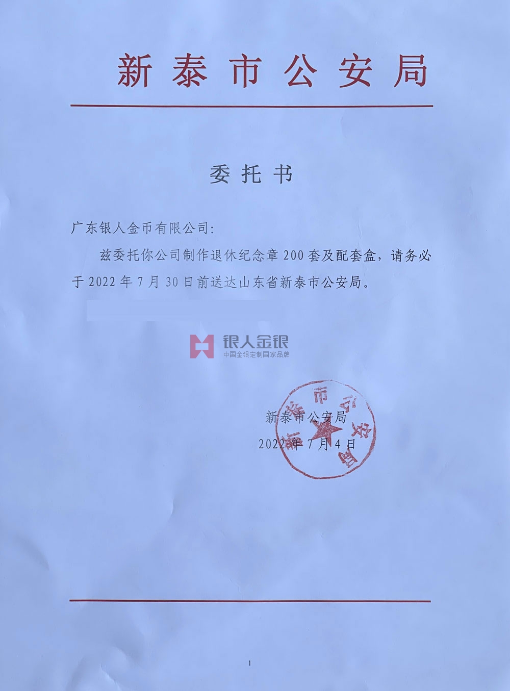 山東公安廳新泰公安局民警退休紀念章定制公函