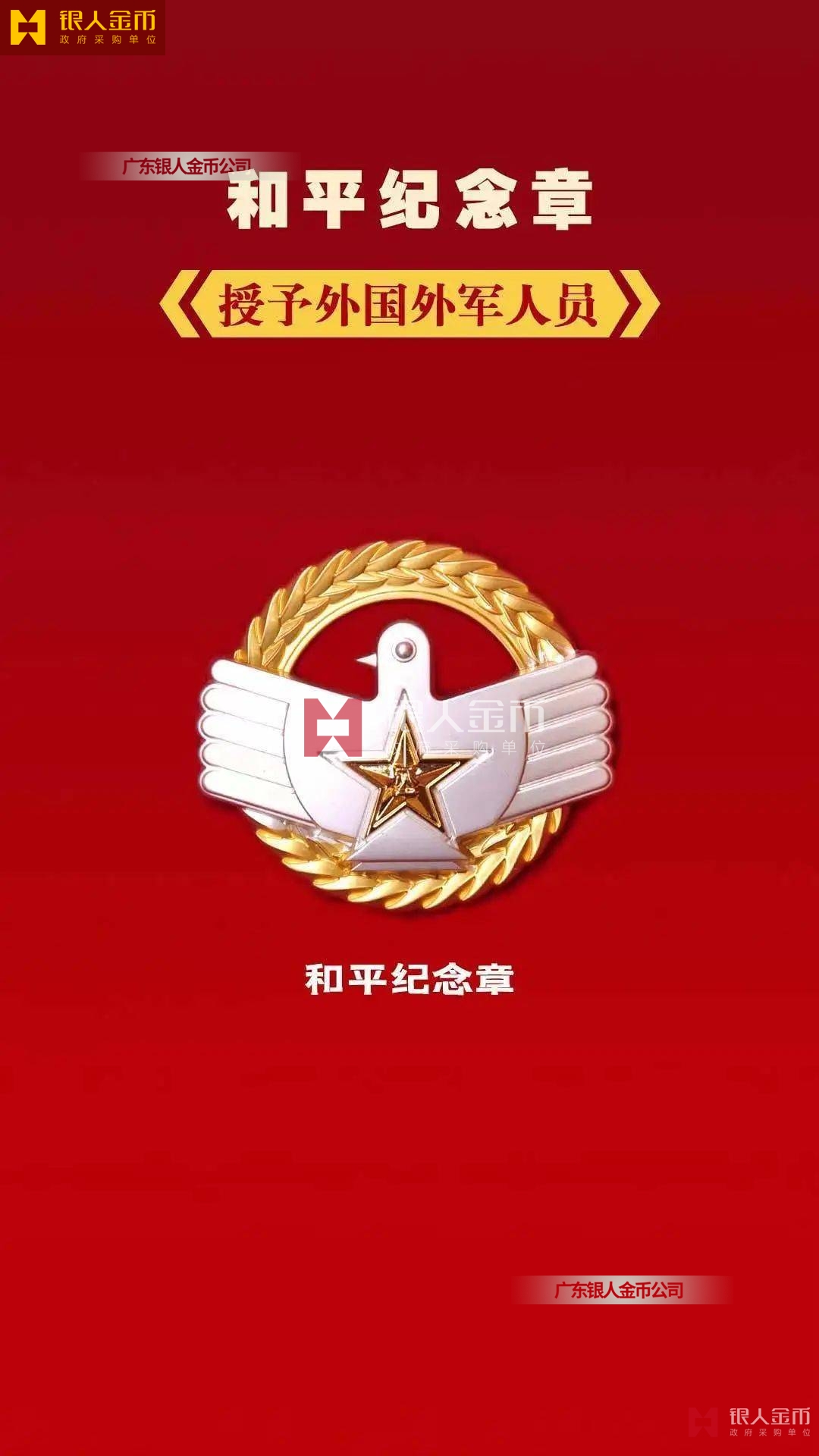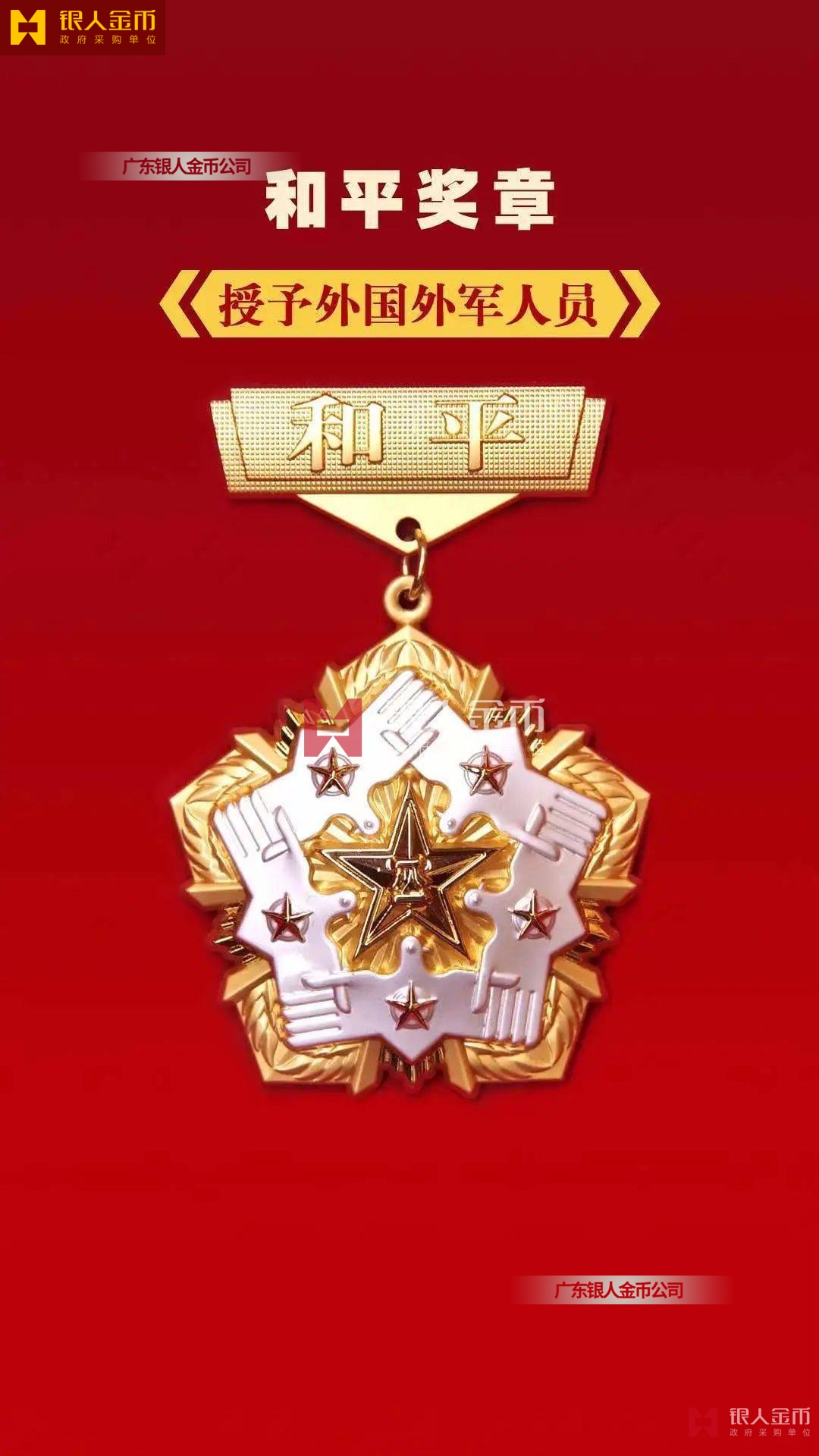 和平紀(jì)念章,由軍徽、和平鴿等元素構(gòu)成,授予外國外軍人員,通徑為35mm。