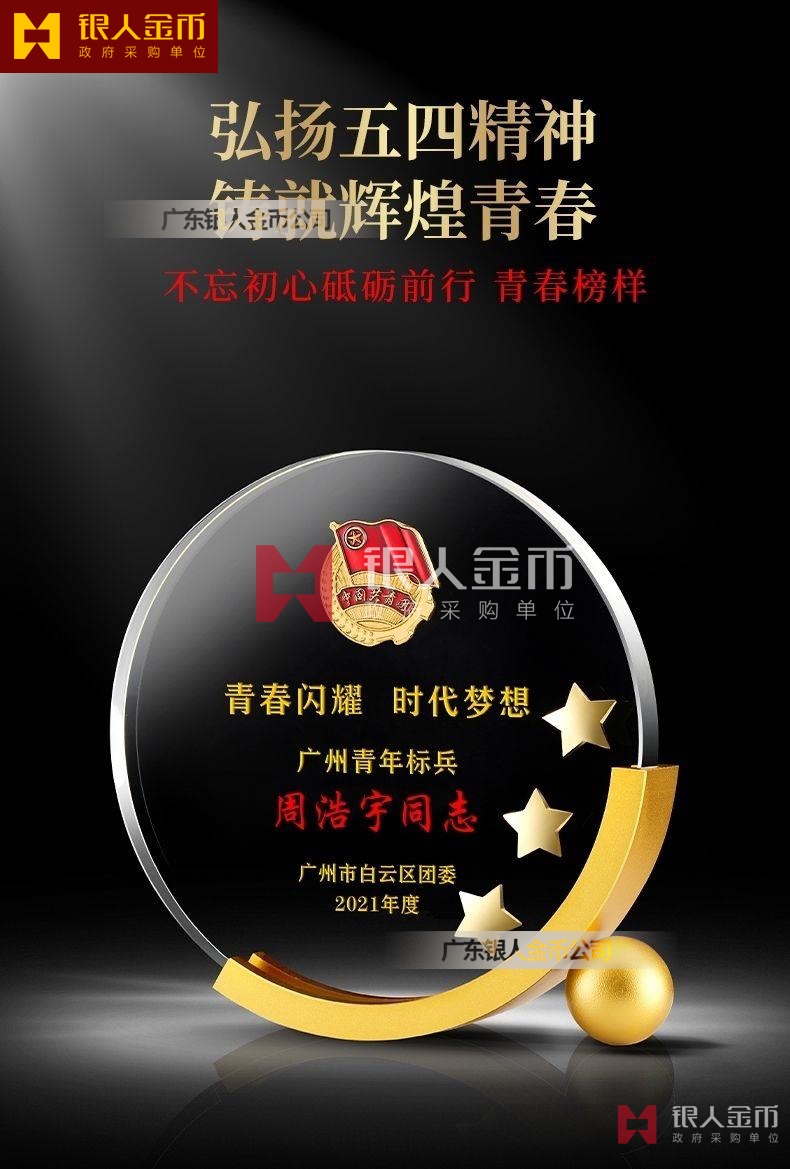 共青團廣州市委員會五四青年標兵優秀團員水晶擺件獎牌水晶獎牌水晶紀念牌制作定制-【廣東銀人徽章獎牌廠有限公司】