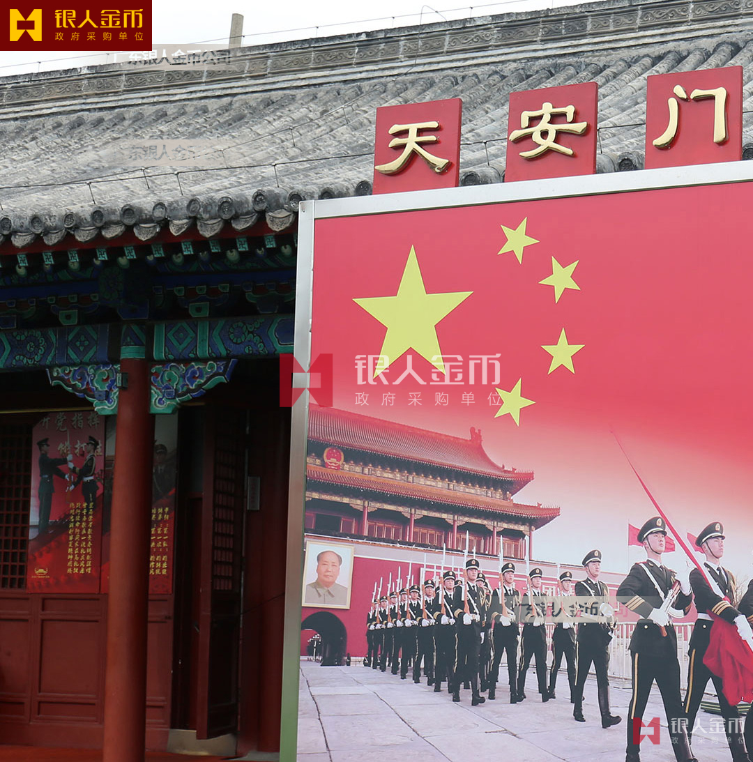 設計元素一五星紅旗、天安門、華表、長城、祥云、70字樣。材料工藝一鋅合金壓鑄工藝,徽體表面采用24K鍍金,國旗采用紅色瓷漆噴漆工藝。