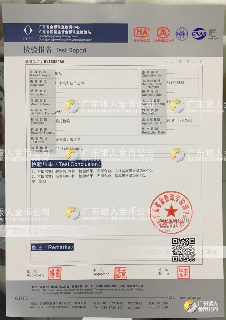 廣東銀人金幣公司承接客戶個性化定制的金銀幣、金銀章、金銀條、金銀牌、金銀盤均由國家質(zhì)監(jiān)部門、嚴(yán)格檢測、權(quán)威鑒定: