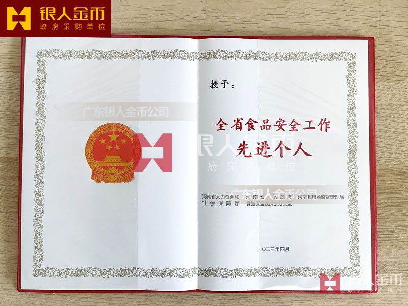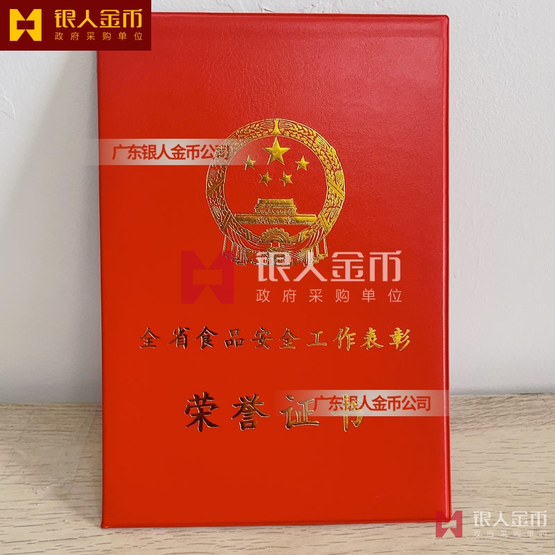 河南省政府全省食品安全工作表彰獎勵證書定制制作_河南省人力資源和社會保障廳獎勵表彰榮譽證書定做_河南省市場監督管理局榮譽獎勵表彰證書訂制